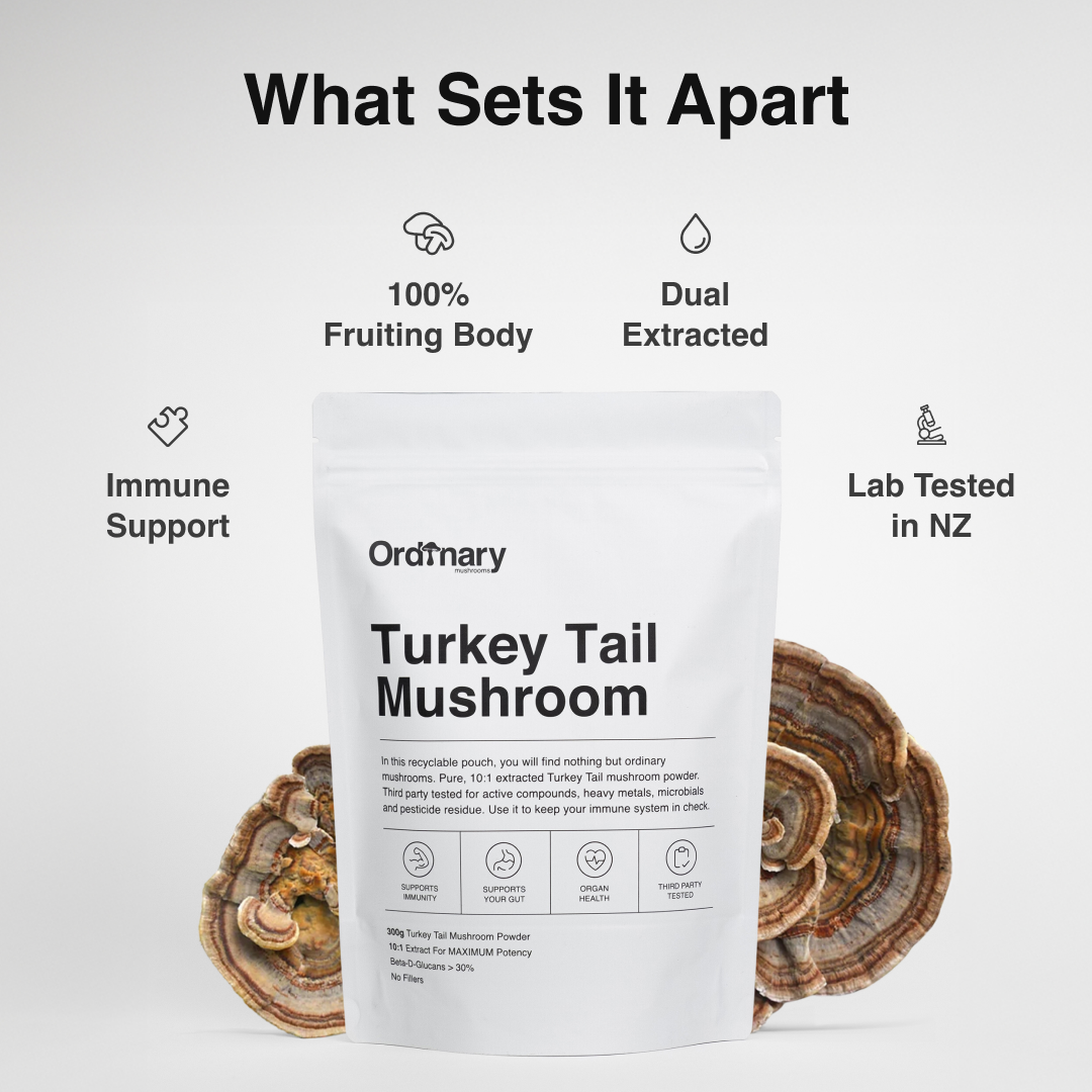 At Ordinary Mushrooms, we’re dedicated to supplying potent mushroom powders that deliver on their promises. Our Turkey Tail powder is 10:1 dual extracted, with high (>30%) levels of beta-d-glucans. No fillers. No nasties. Only pure, undiluted Turkey Tail for maximum effect.