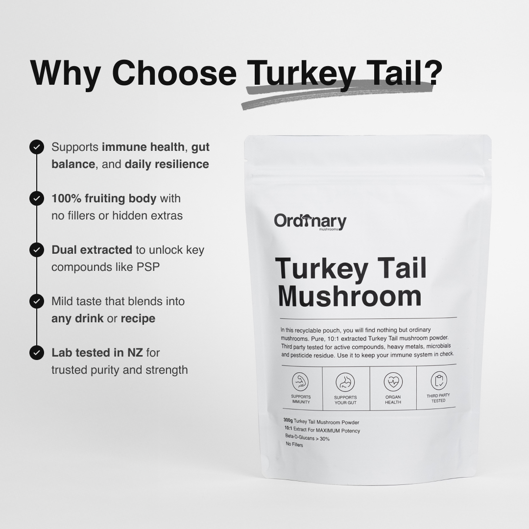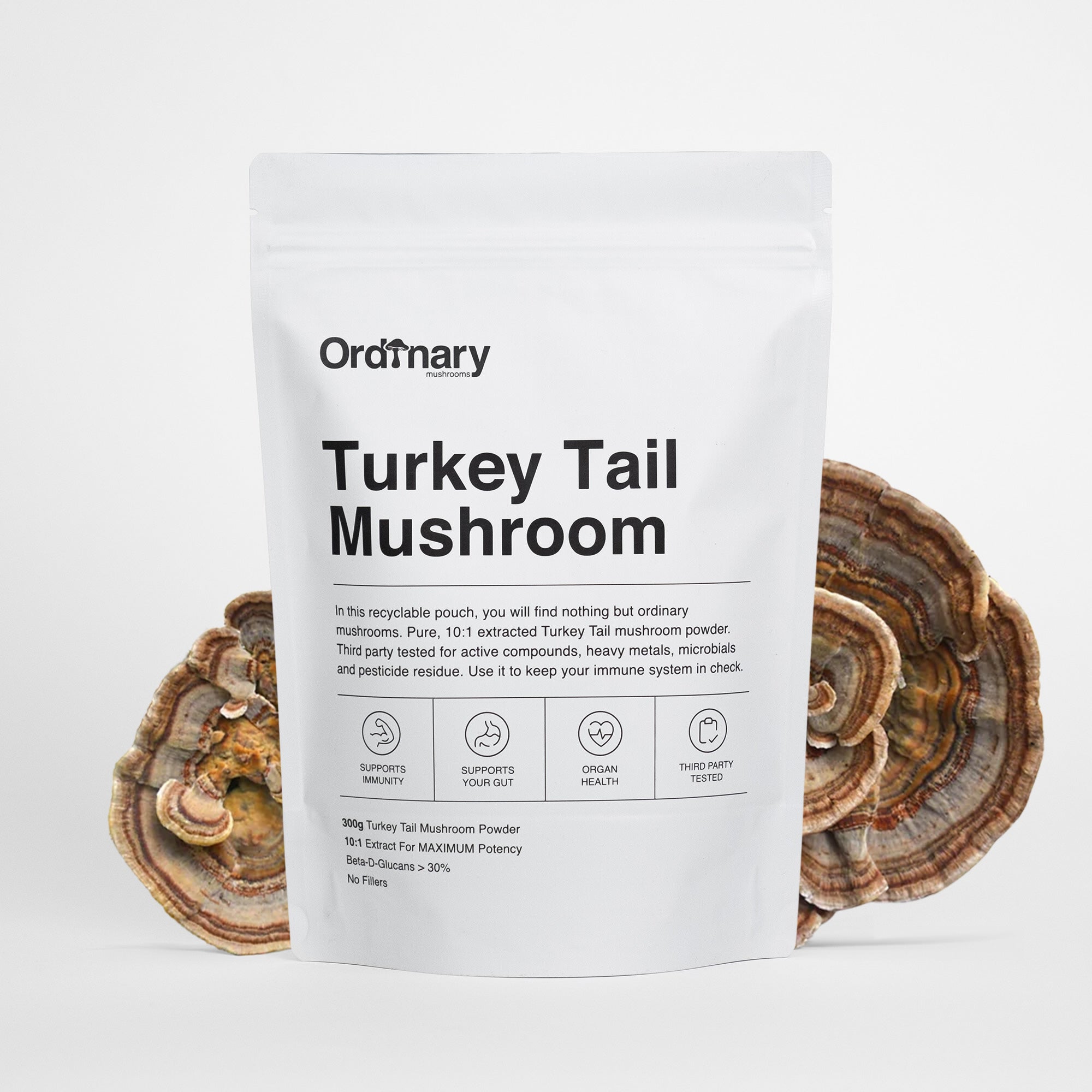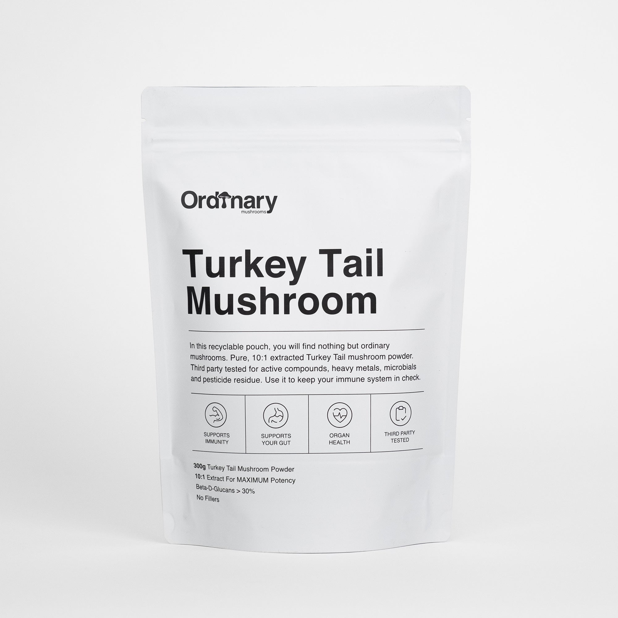 Ordinary Mushrooms Turkey Tail powder is made from pure Turkey Tail mushrooms, known for their rich history in traditional herbal practices. Available in both 125g and 300g pouches, this product offers a flexible way to enjoy the potential benefits of this powerful mushroom.